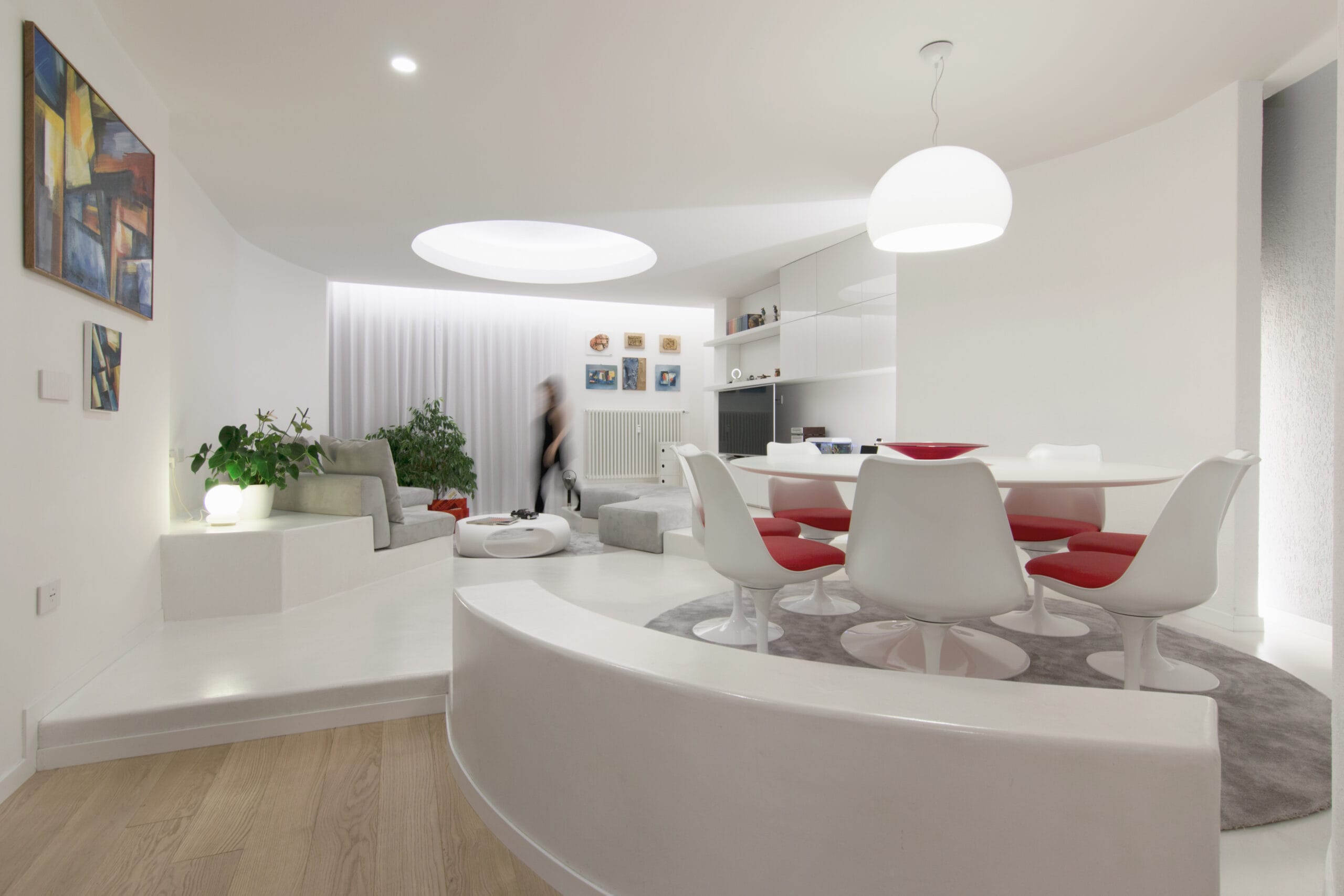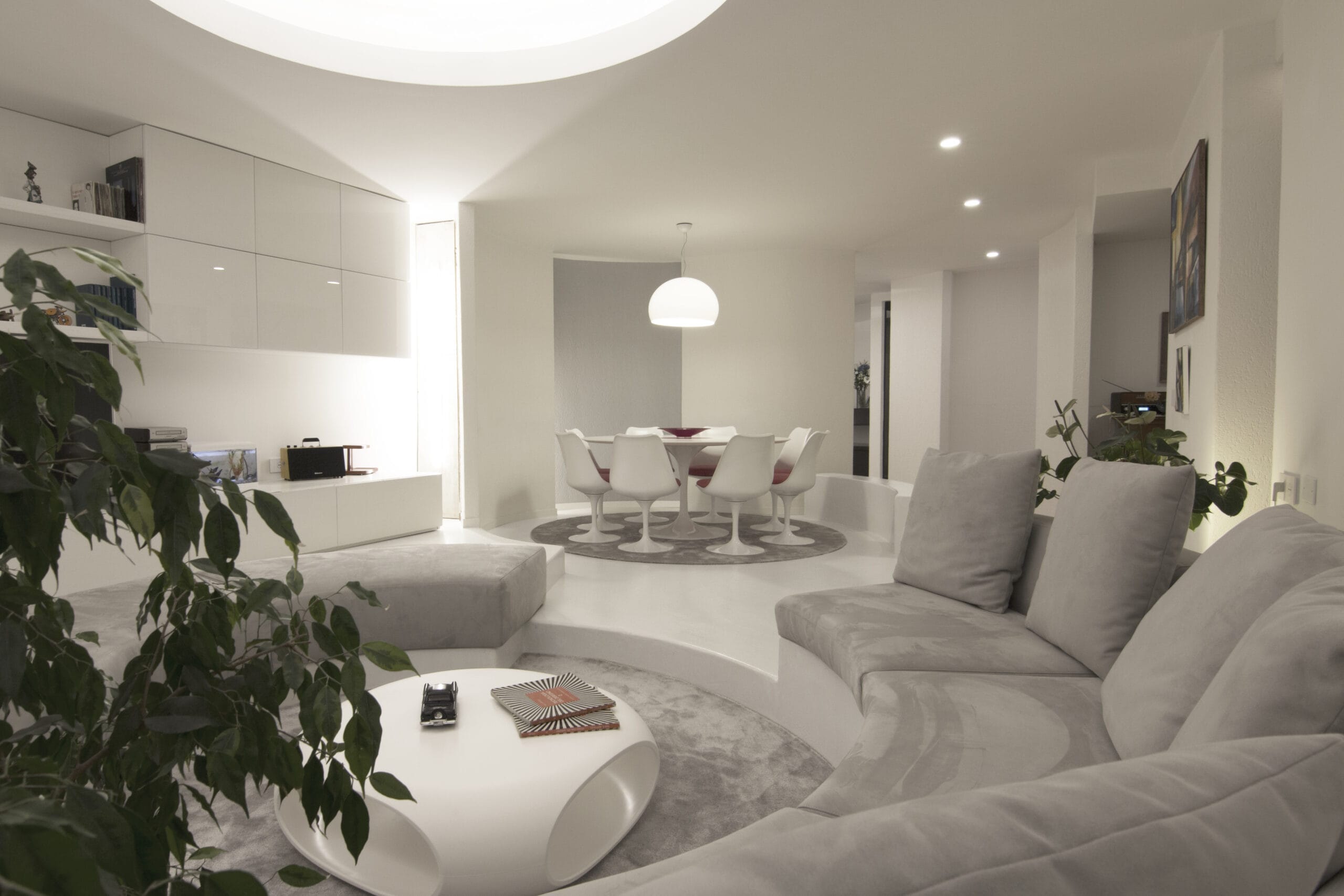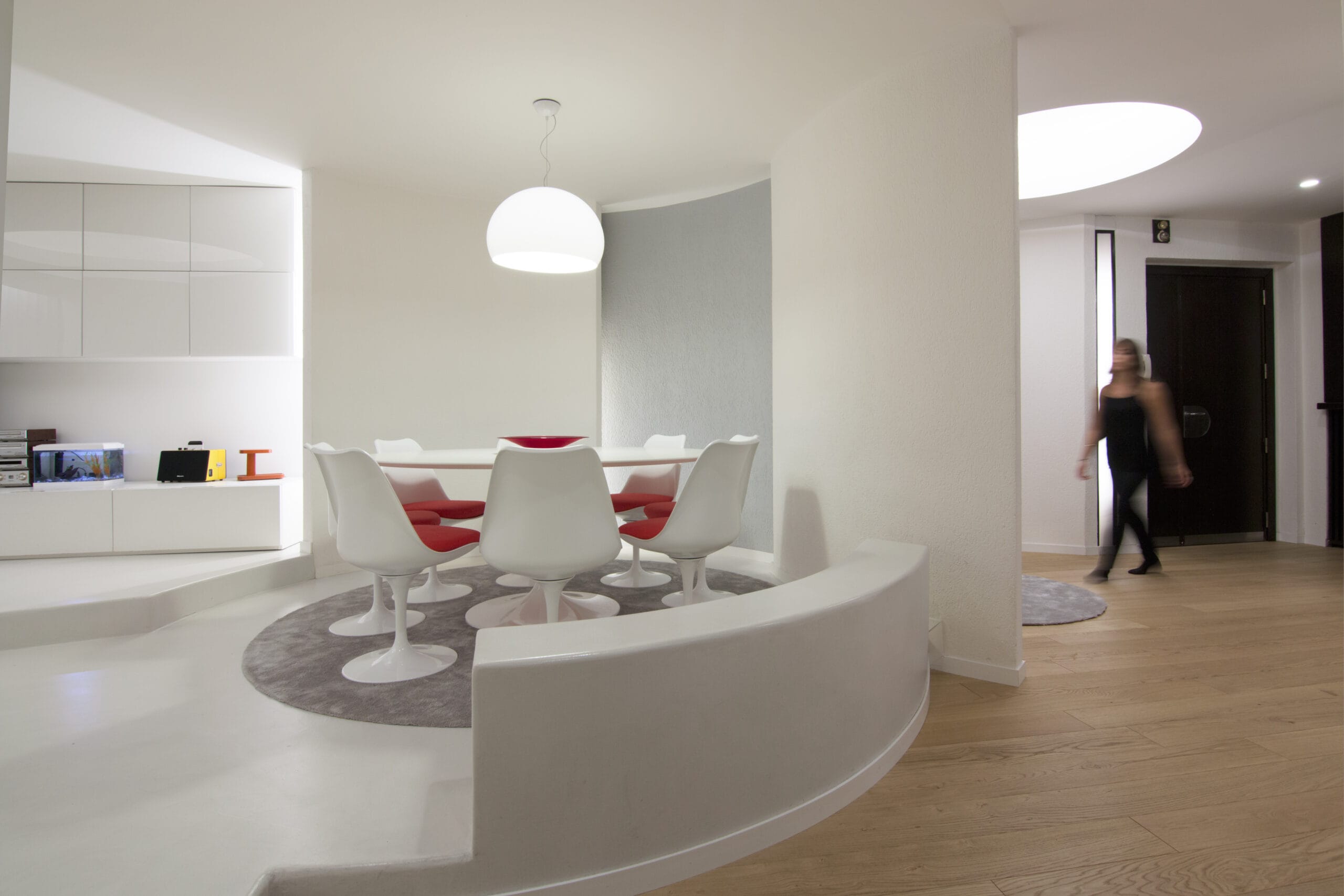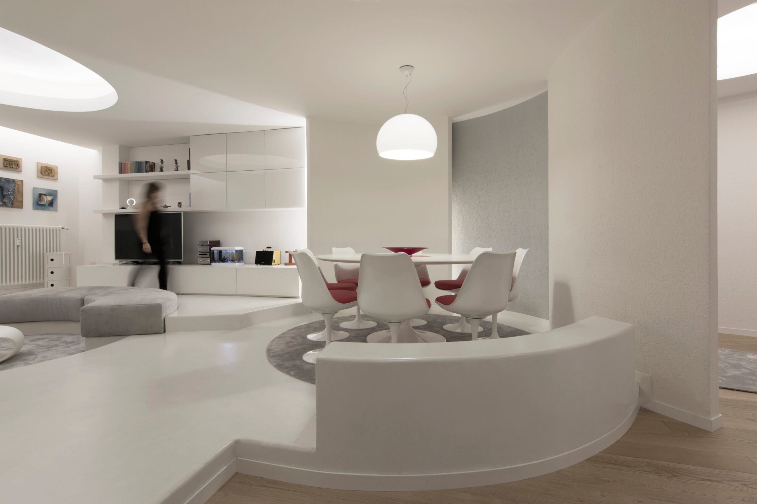 Il progetto ha interessato la ristrutturazione di un appartamento dal forte carattere anni ’70, con arredi su misura, linee tondeggianti, luci integrate e una cucina industriale in acciaio.