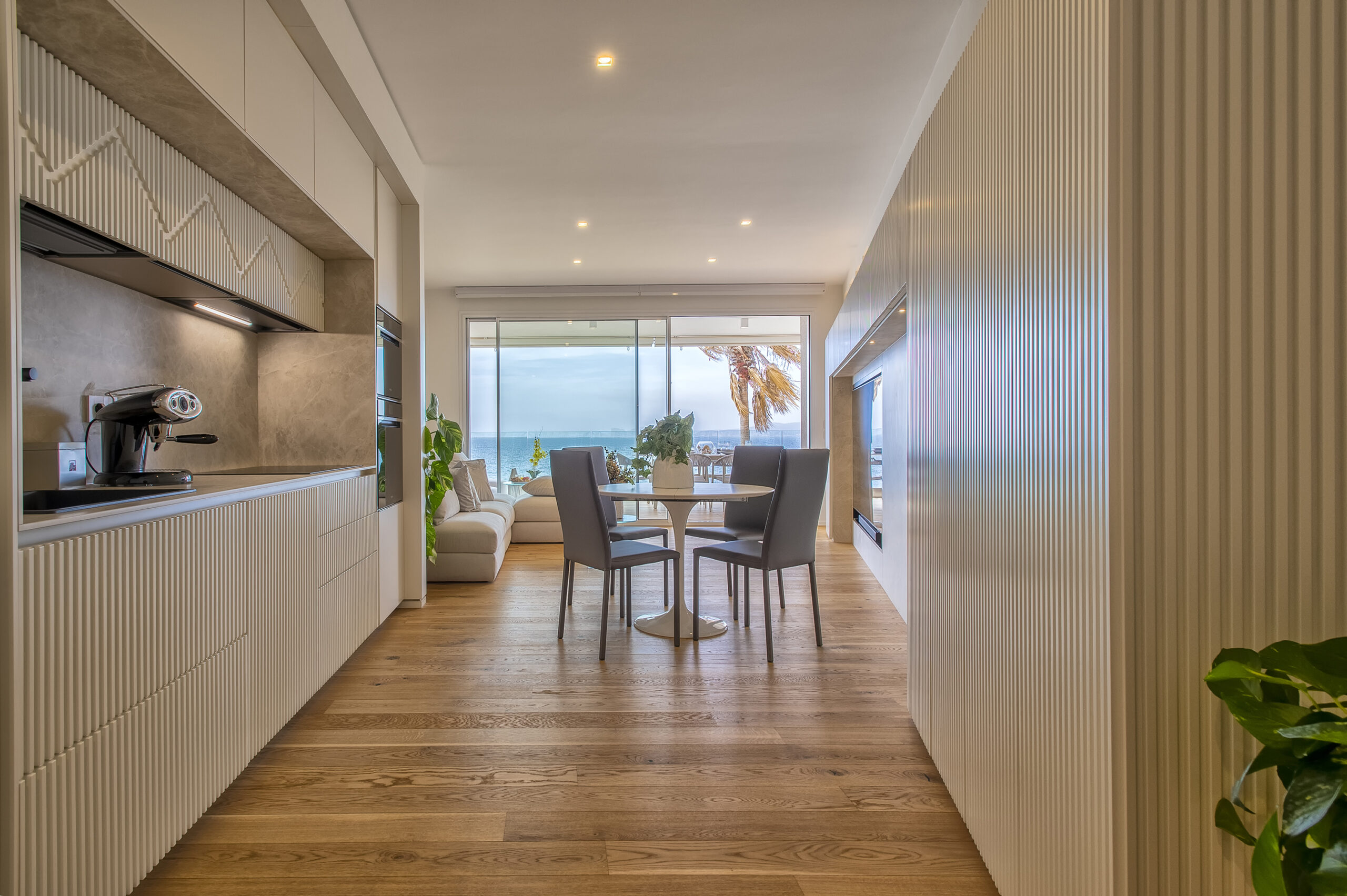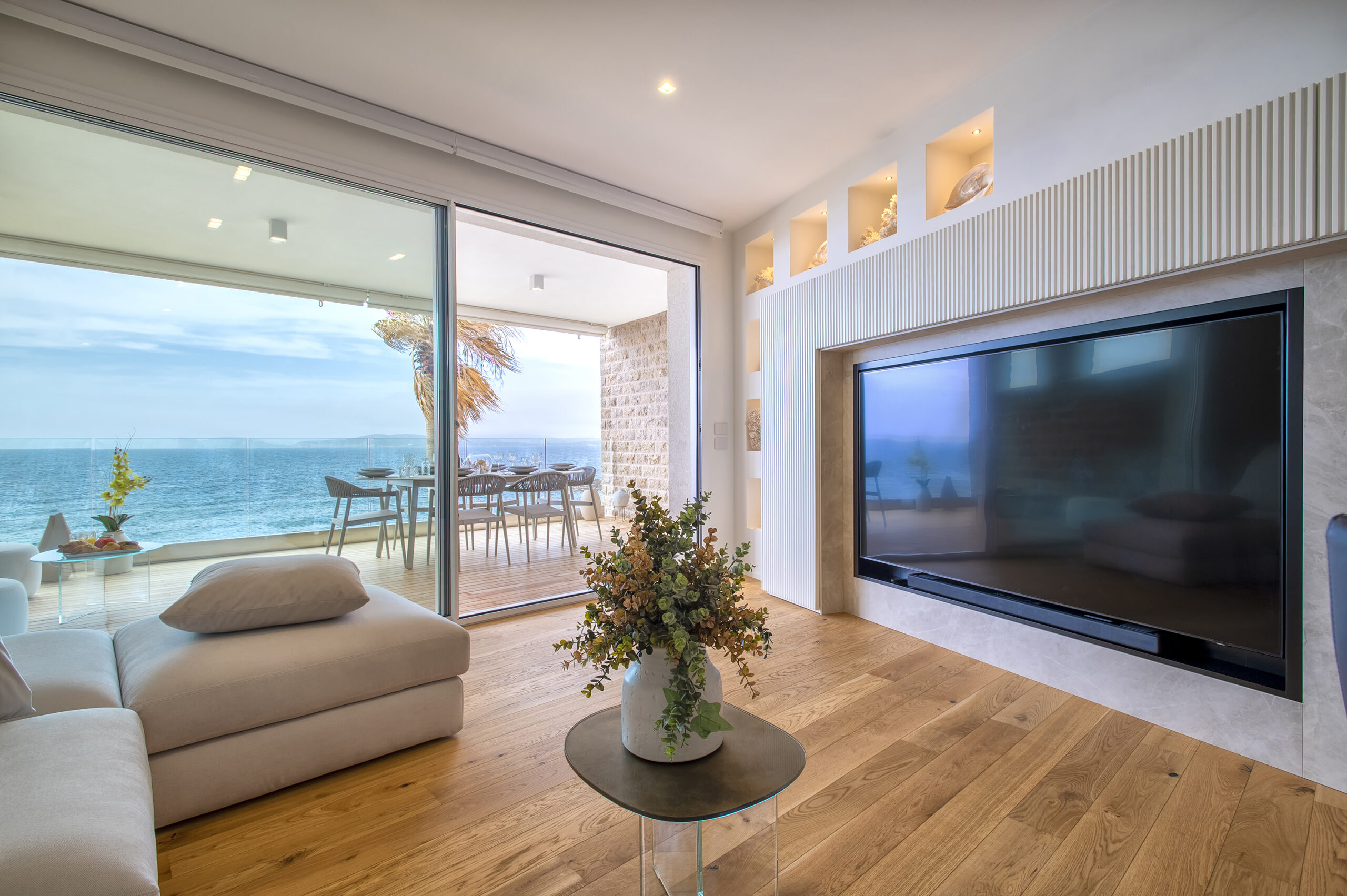 Ampie vetrate scorrevoli incorniciano la vista sul mare, prolungando idealmente gli interni verso l’esterno e valorizzando il dialogo tra architettura e paesaggio.