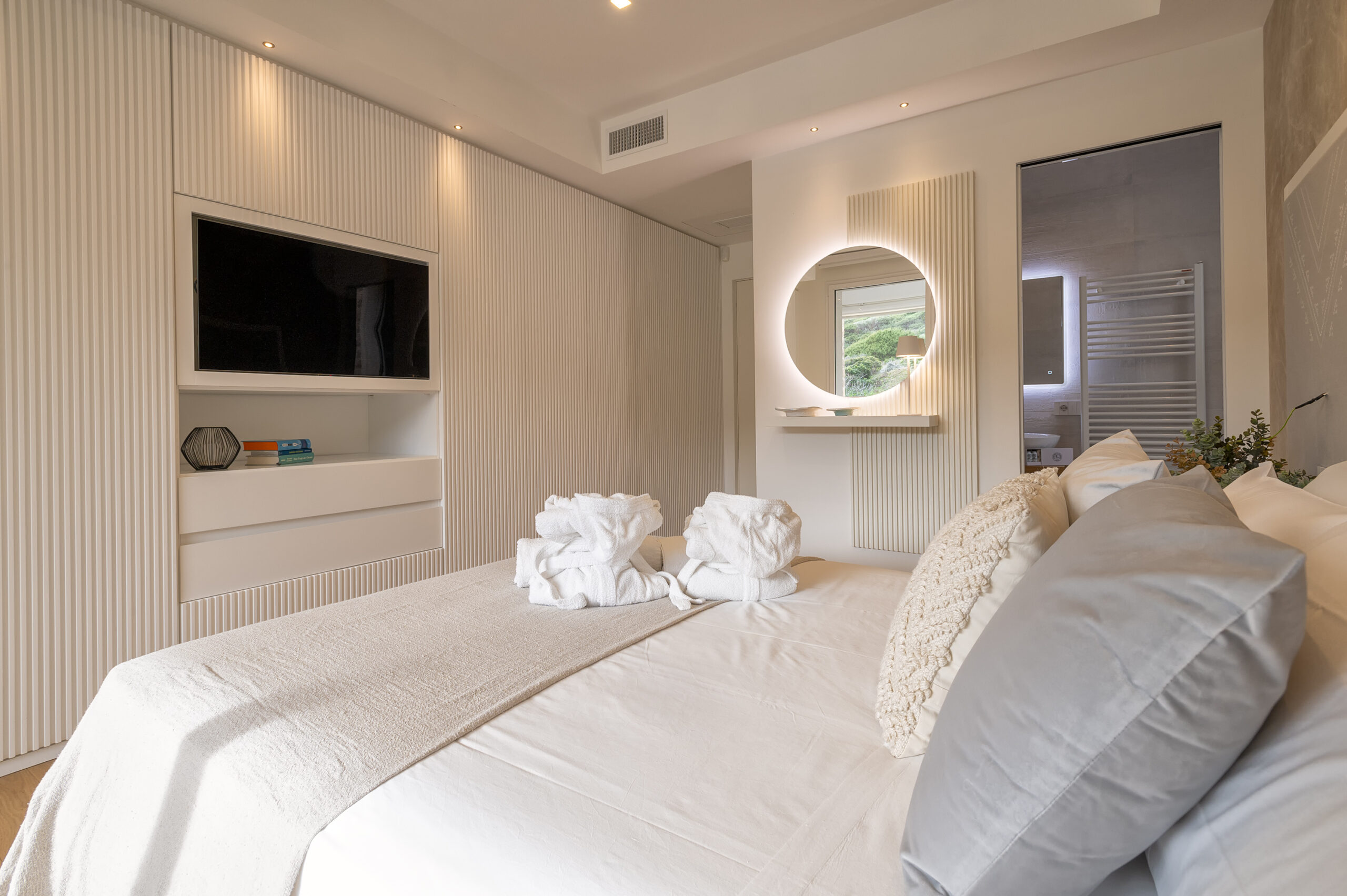 Lo stesso linguaggio materico e stilistico si ritrova anche nelle camere da letto, arredate con la stessa cura nei dettagli: boiserie in legno, armadiature integrate e nicchie attrezzate per offrire il massimo comfort in ambienti raccolti e rilassanti.