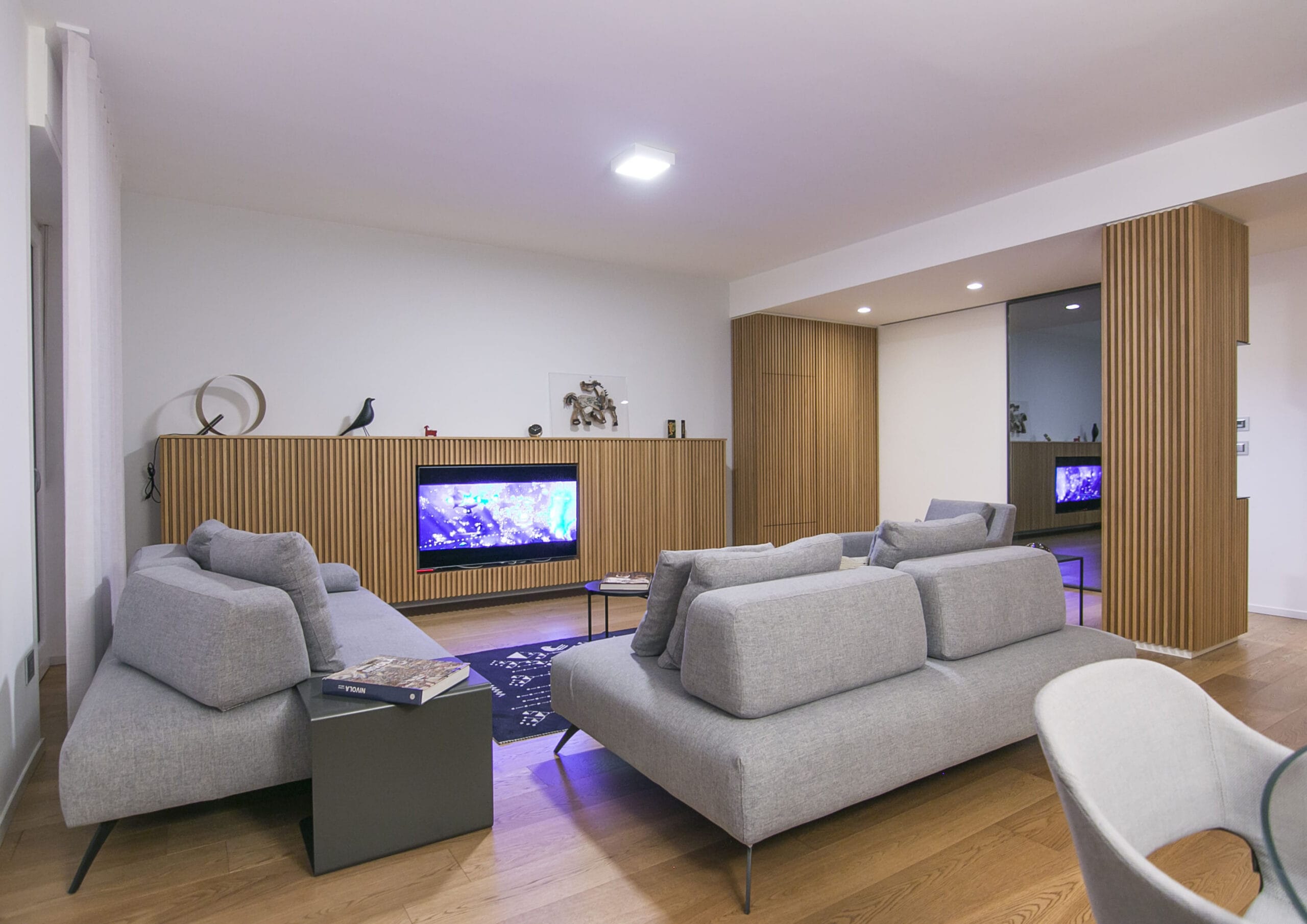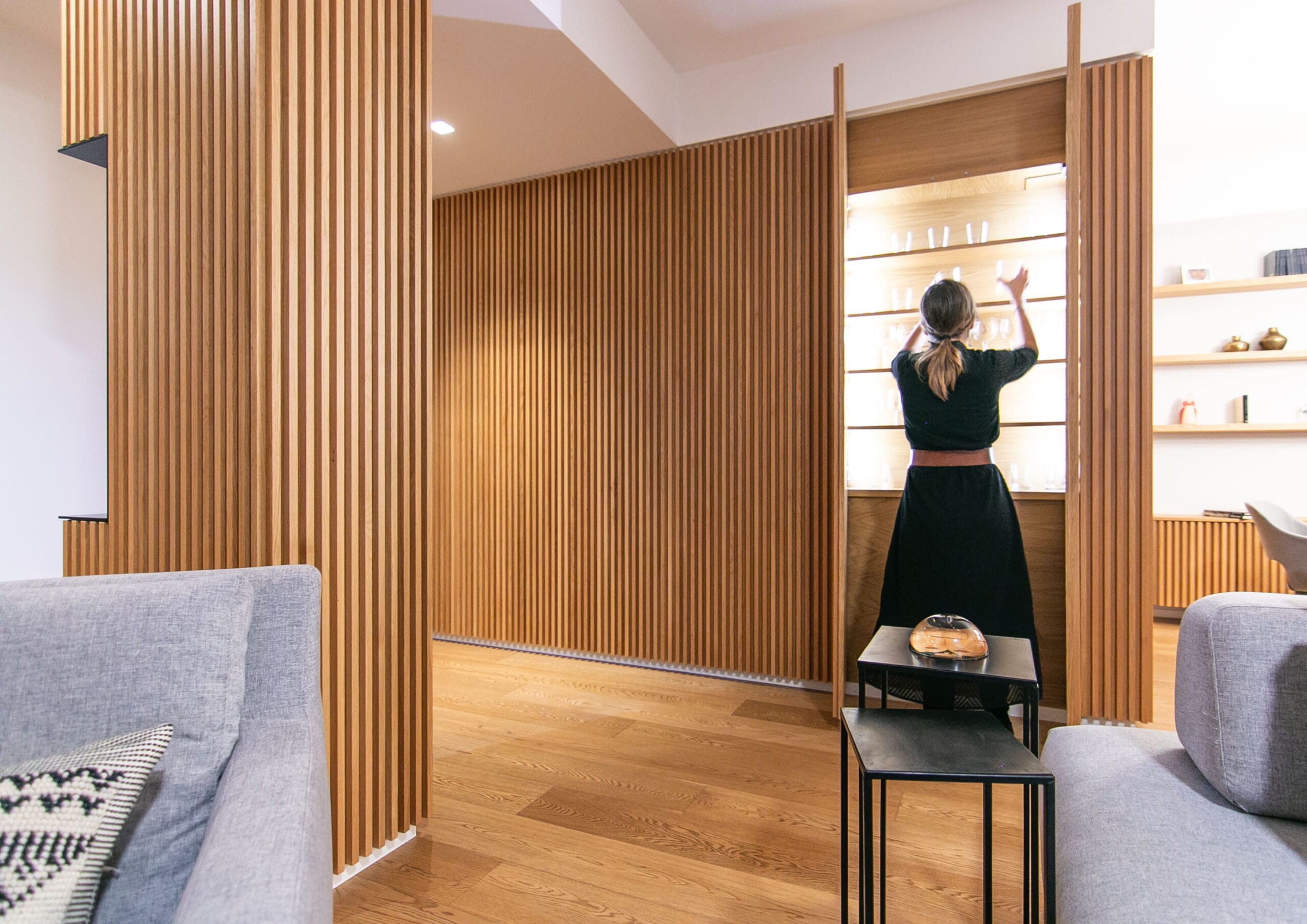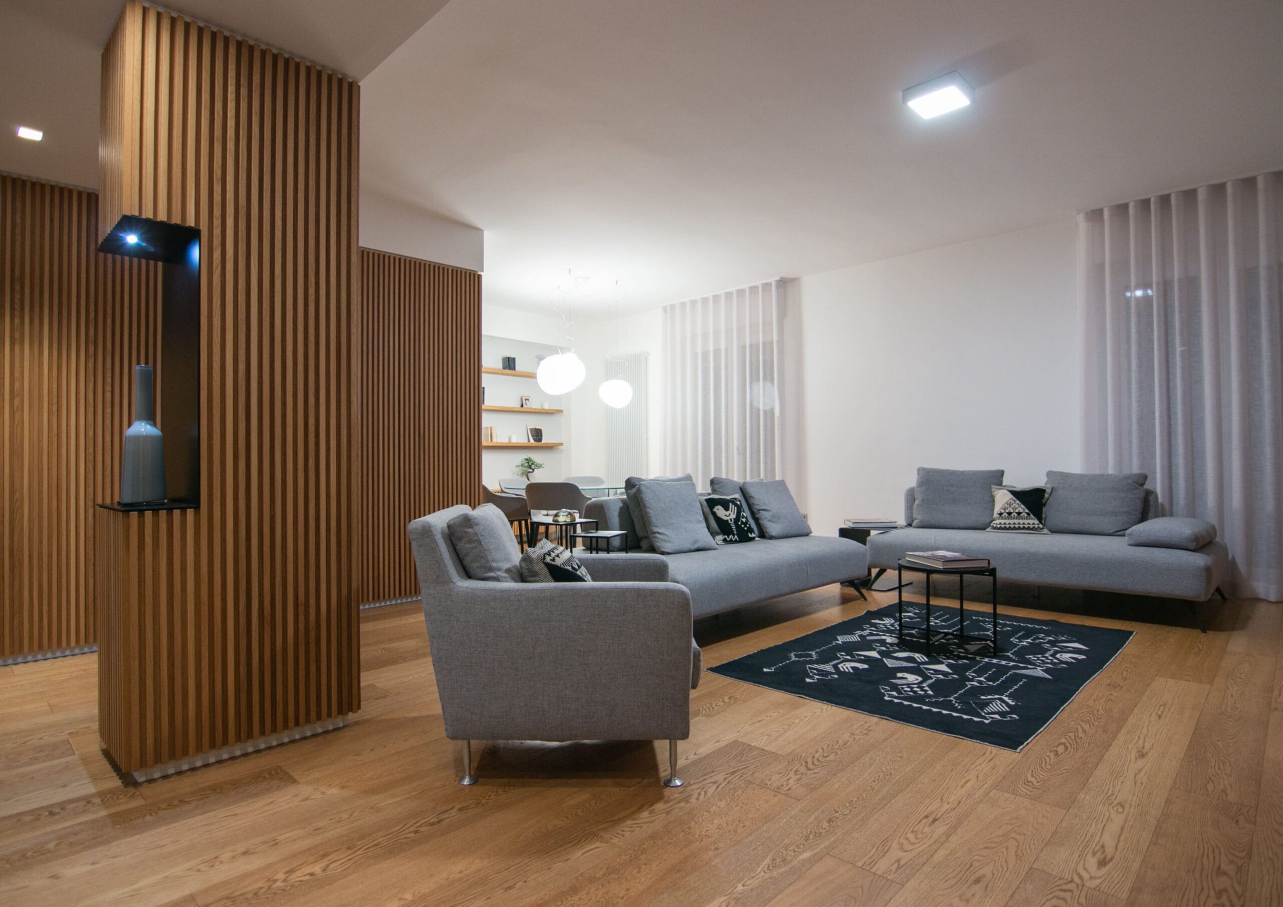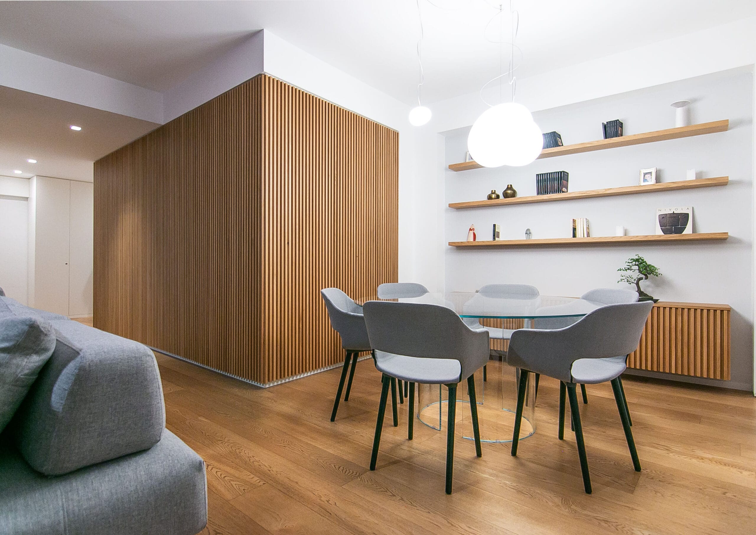 Un sistema di listelli verticali in rovere, in abbinamento al pavimento, crea un filo conduttore tra gli ambienti: accoglie il visitatore all’ingresso, definisce la zona pranzo e nasconde con eleganza vani, nicchie e impianti. Il motivo si integra con il ribassamento in cartongesso e diventa elemento decorativo e funzionale.